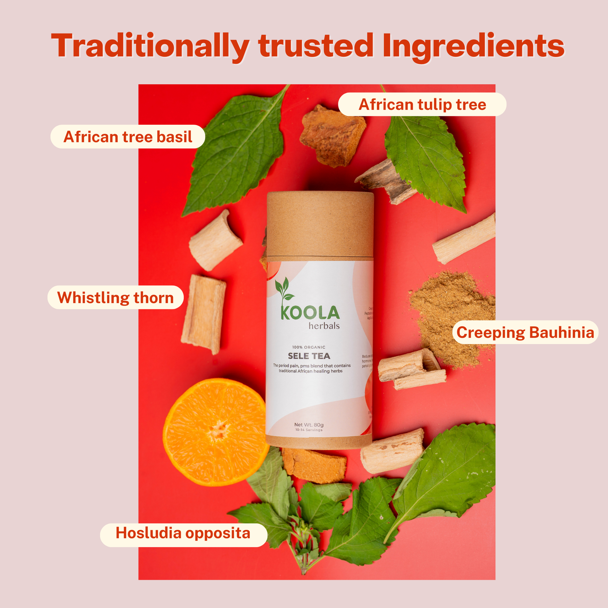 Sele Tea brings together African Tree Basil, Guava leaves, and Coral tree bark. They support calm moods by soothing stress, relaxing the body, and steadying hormone-linked ups and downs.