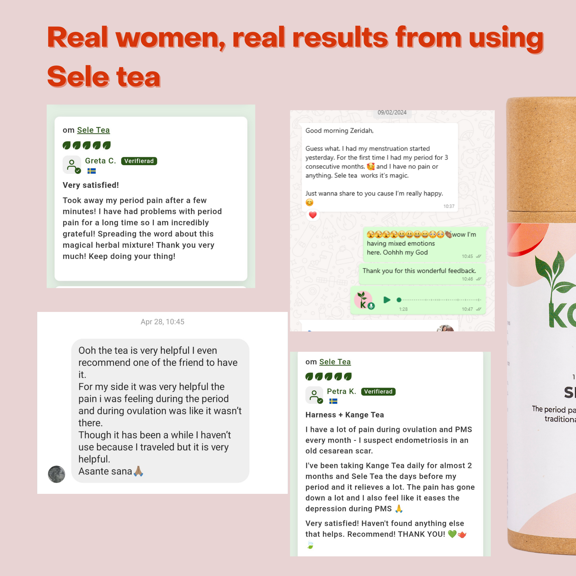 Testat Kange Tea dagligen i snart 2 månader och Sele Tea dagarna före mens och det lindrar väldigt mycket. Smärtan har gått ner massor och känner även att det lättar nedstämdheten vid pms 🙏